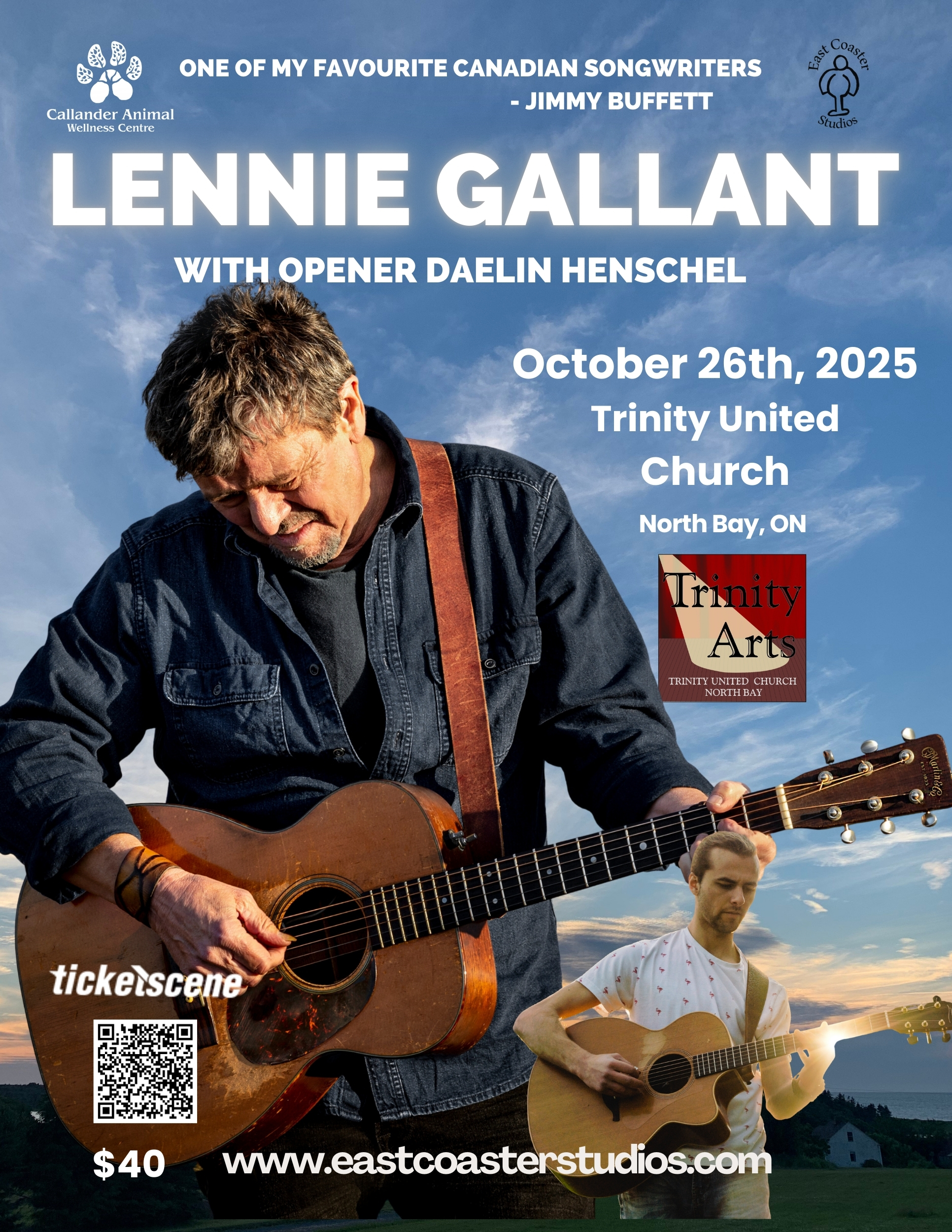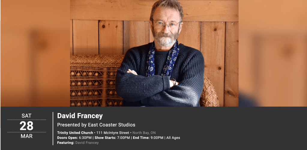 Oct 26th features the pride of PEI, Lennie Gallant, and North Bay’s own, Daelin Henschel, as an opener displaying his wizardry on guitar. East Coast songwriter Lennie Gallant has released fifteen albums of original songs which have won him a host of awards and nominations. His song Peter’s Dream was inducted into the Canadian Songwriters Hall of Fame. He is an international touring artist and his songs have been covered by many artists, and he has shared the stage with several orchestras and with performers such as the late Jimmy Buffett and David Foster and his band. Lennie struck up a friendship with Jimmy and has two co-writes on Jimmy’s last album, and was invited to sing on it as a featured artist. One of Lennie’s albums also went up to the International Space Station and circled the planet 248 times. He and partner Patricia Richard also record and perform as the popular Francophone duo, Sirene et Matelot. Lennie Gallant is a member of the Order of Canada and has been recognized for his humanitarian efforts.