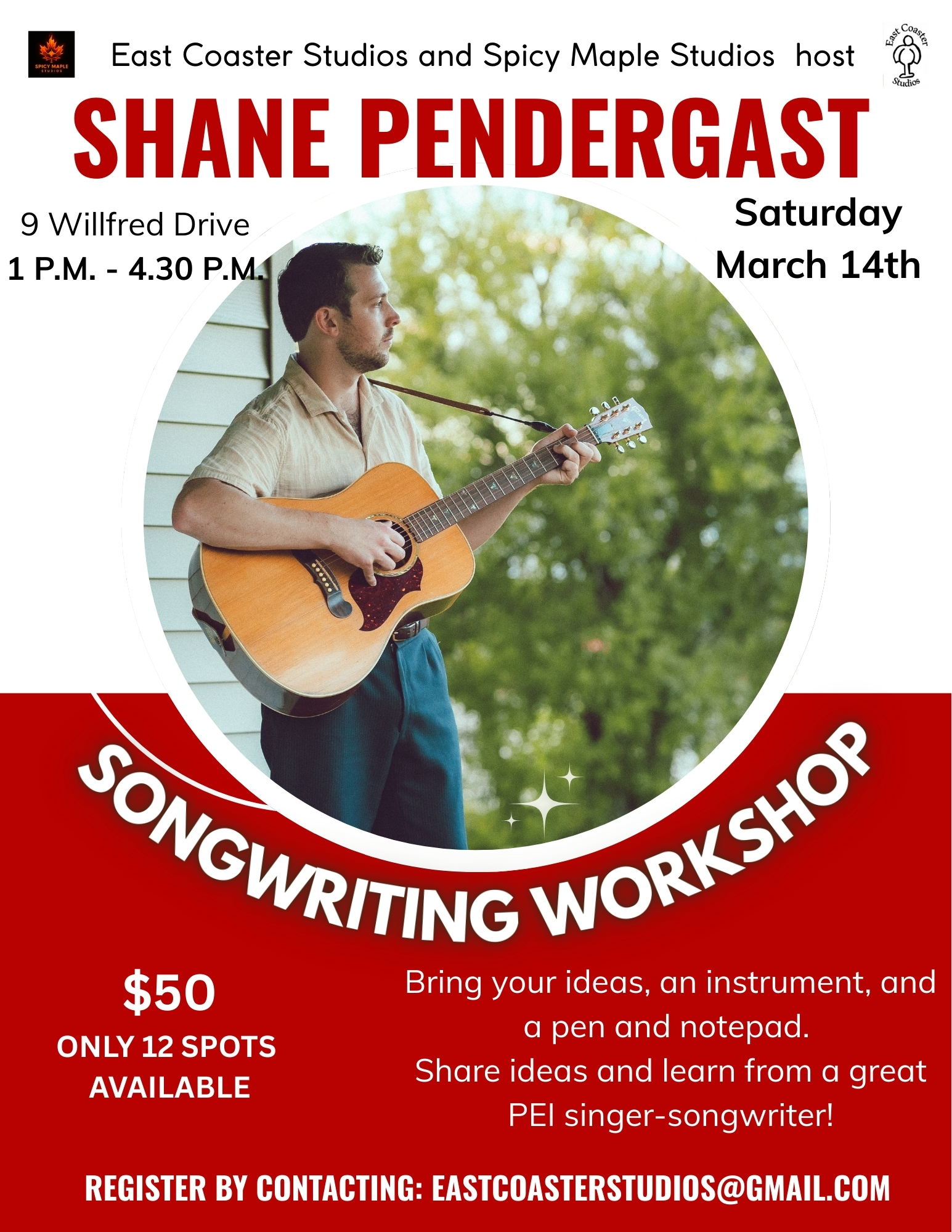 The day after the big show (March 14th) Shane will be hosting a songwriting workshop put on by Spicy Maple Studios and east Coaster Studios. Spots are limited for this workshop!